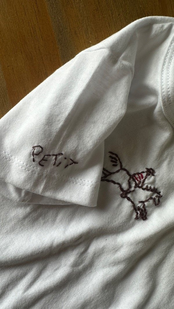 Detalle de ¨Petit¨ bordado a mano en el hombro derecho.