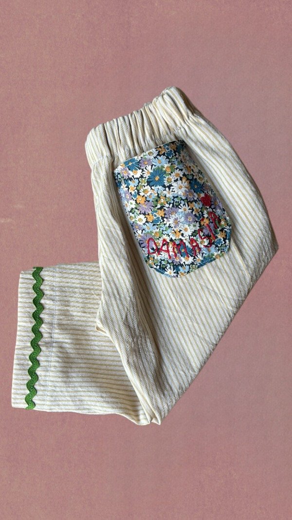 Pantalón confeccionado en Tusor rayitas finas mostaza, con detalle de bolsillo en Liberty en la parte trasera.